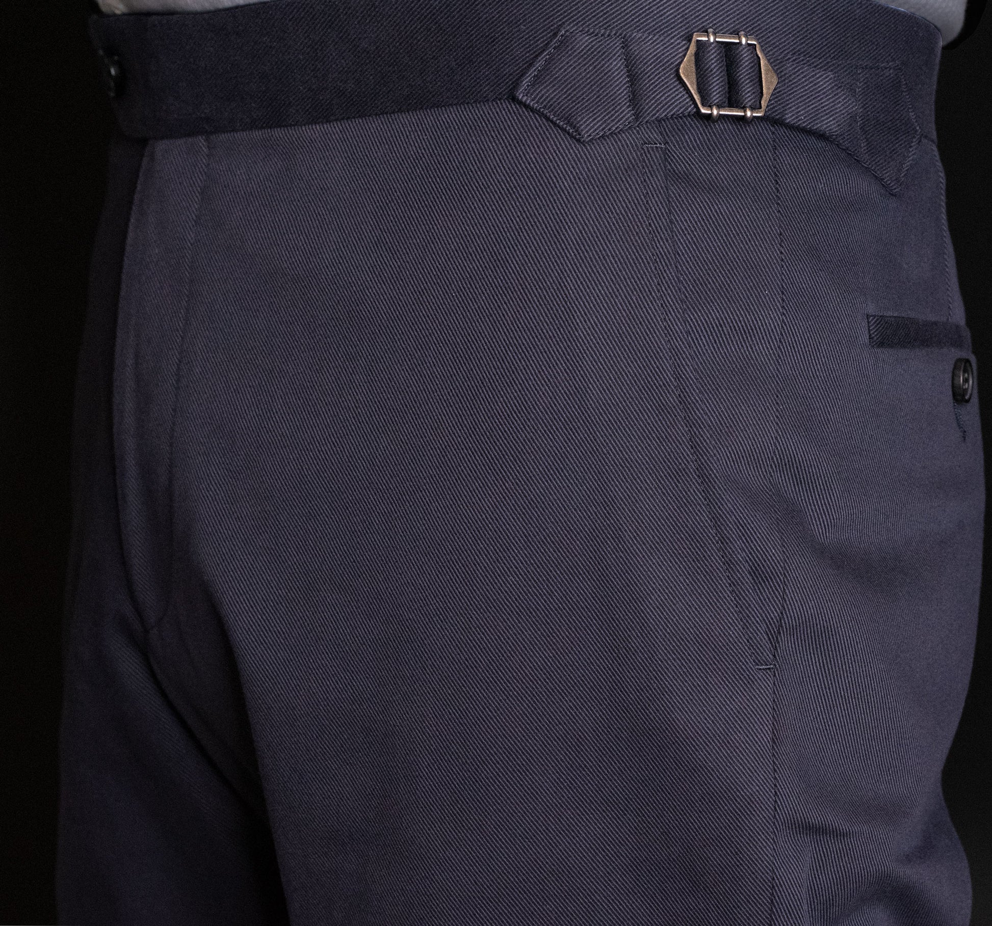 Navy chinos. Buksen kommer i modellen CATANIA som er litt lengre og litt videre enn våre standard dressbukser. Denne buksen har side-adjusters og ingen beltehemper.