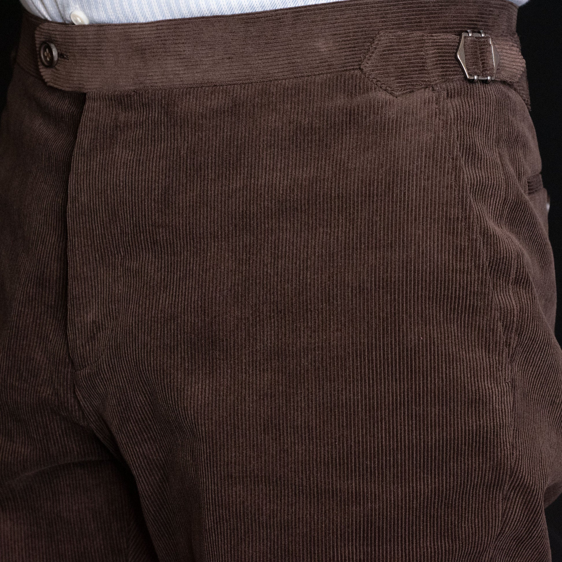 Mørkebrun cordbukse. Buksen kommer i modellen CATANIA som er litt lengre og litt videre enn våre standard dressbukser. Denne buksen har side-adjusters og ingen beltehemper.