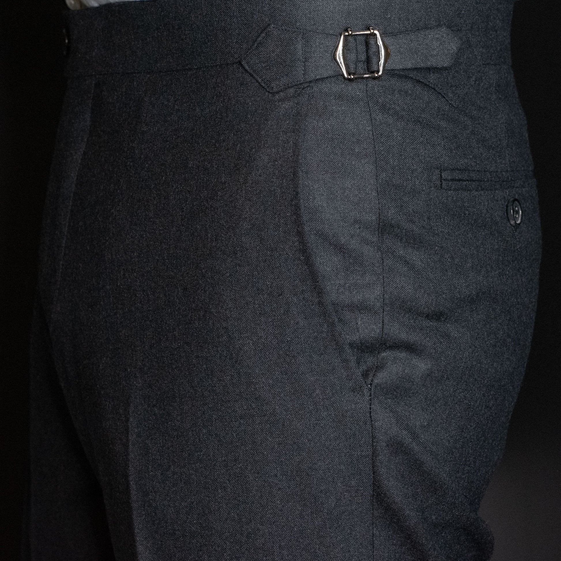 Koksgrå flanellbukse i 100% ull. Buksen kommer i samme modell som våre dressbukser. Denne buksen har side-adjusters og ingen beltehemper.