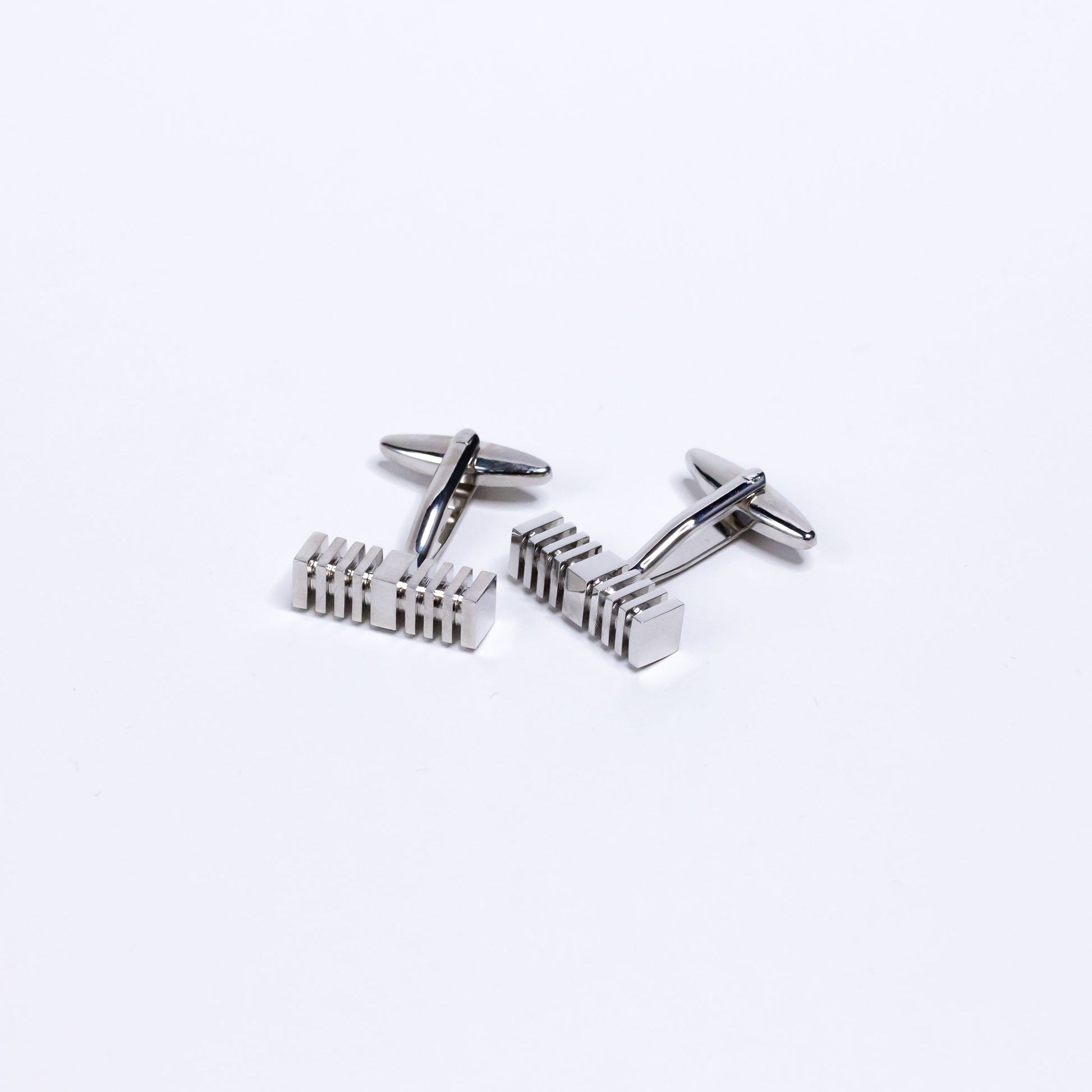 Firkantede mansjettknapper, sølvfarget med striper. Disse mansjettknappene passer godt til smokingskjorte, men de går også fint til en hvit skjorte med dress.