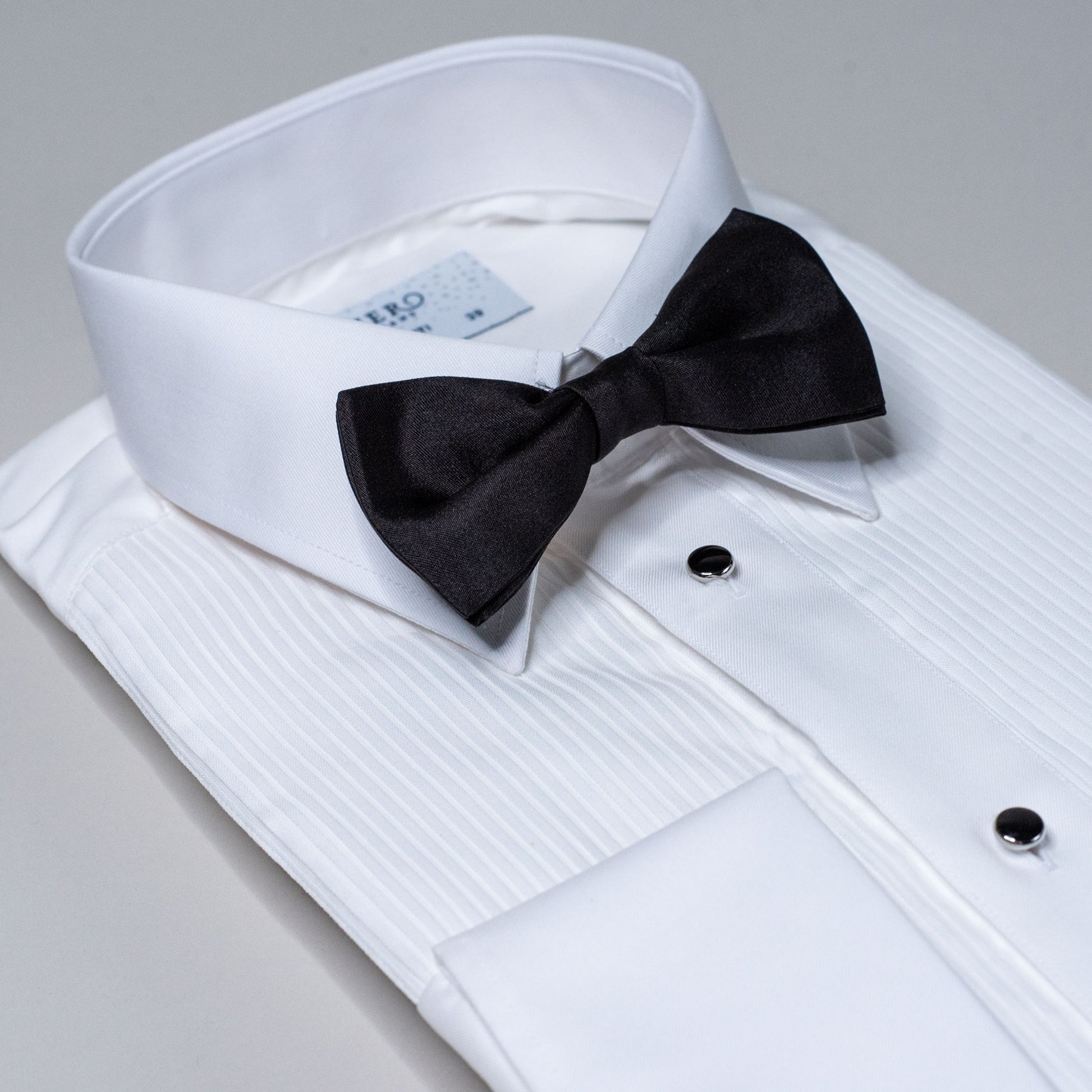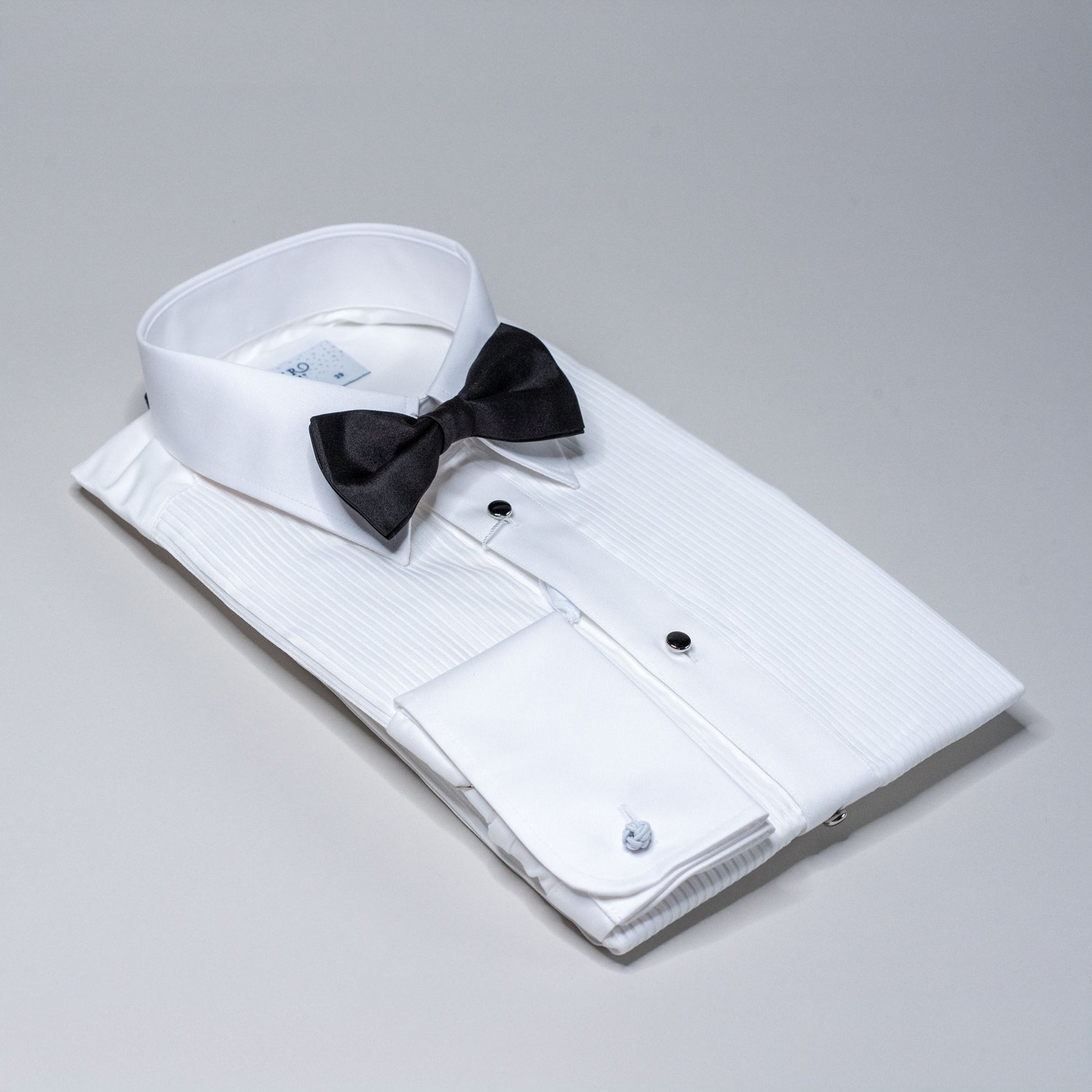 Smokingskjorte med plissé og fire svarte studs (knapper) i front. Studs (4 stk) følger med skjorten, mens mansjettknapper må kjøpes separat. Øvrige knapper er i hvit perlemor. Skjorten har en klassisk krage og passer til både svart og midnightblue smoking. Den passer også fint til smoking med sjalskrage eller peak krage (spisse slag).
